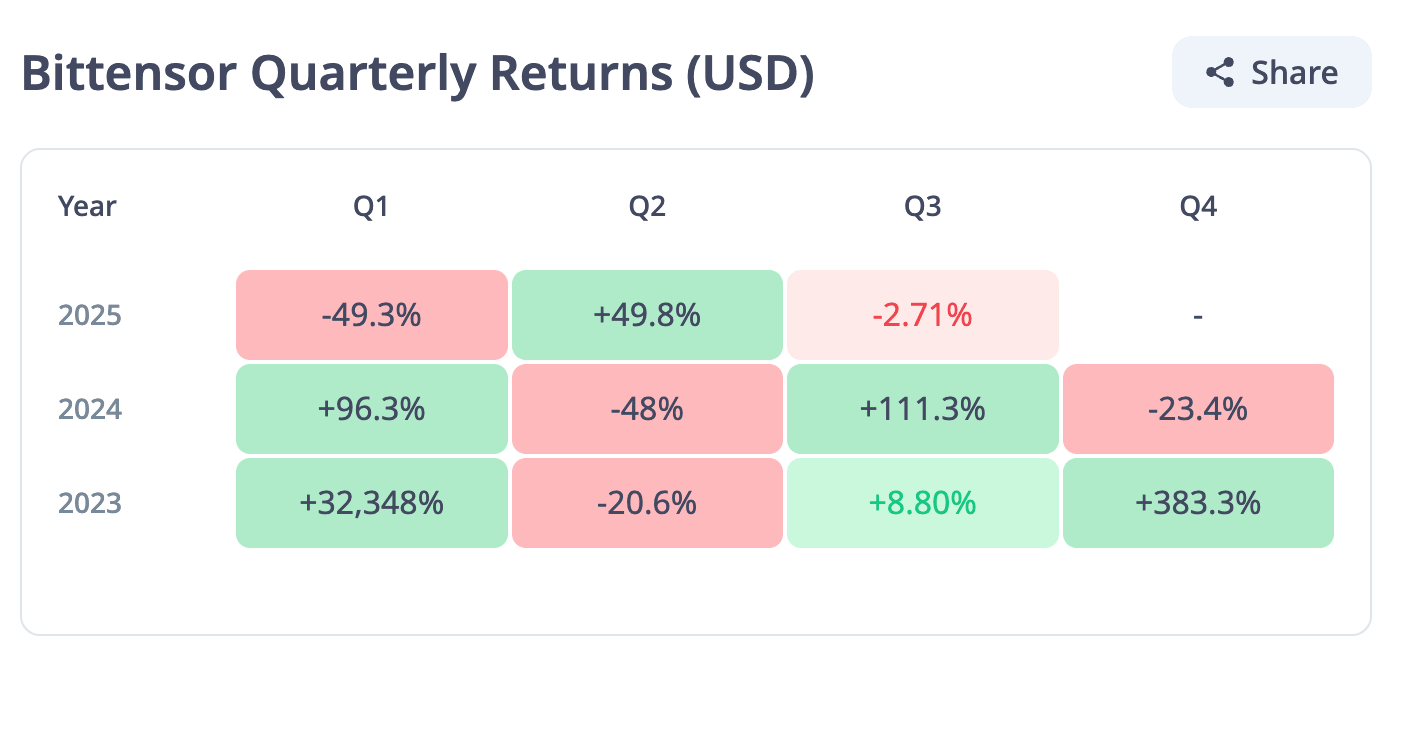 La caída en los rendimientos rompió una racha alcista de dos meses, durante la cual los rendimientos de Bittensor promediaron el 59% en mayo y se situaron ligeramente por encima del 21% en junio. En cuanto a los rendimientos trimestrales, TAO redujo pérdidas en el segundo trimestre con un aumento del 50% en el precio en comparación con una disminución del 49% en el primer trimestre.