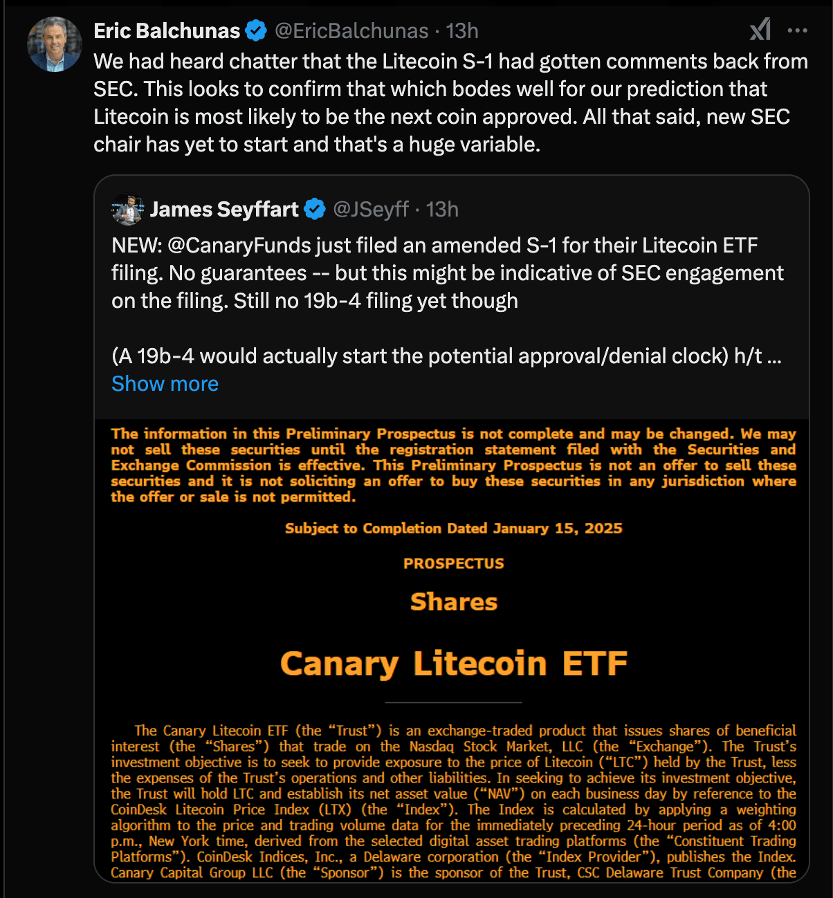 - El analista de ETFs de Bloomberg Eric Balchunas ha insinuado que la solicitud de ETF de LTC de Canary Capital podría ser aprobada a continuación.
