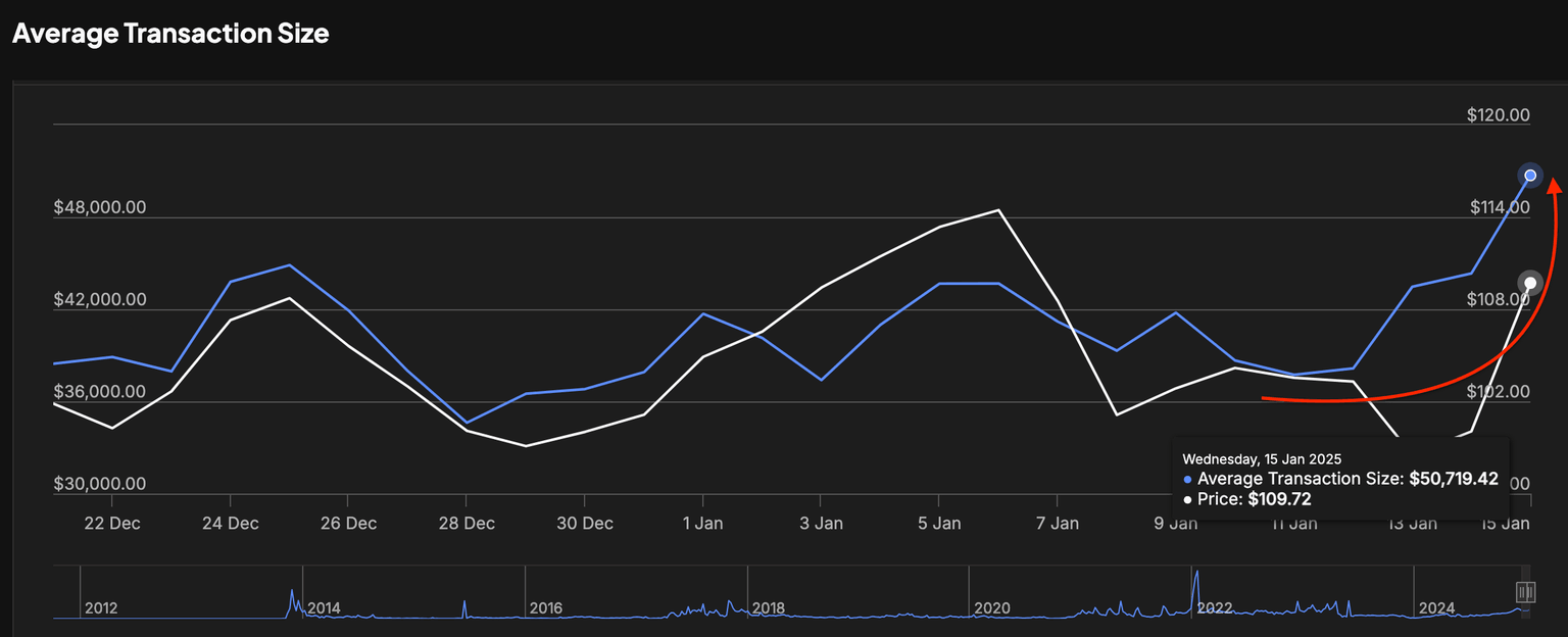 El aumento del tamaño promedio de transacción es a menudo una señal reveladora de acumulación activa de ballenas y de operadores minoristas realizando apuestas más grandes.