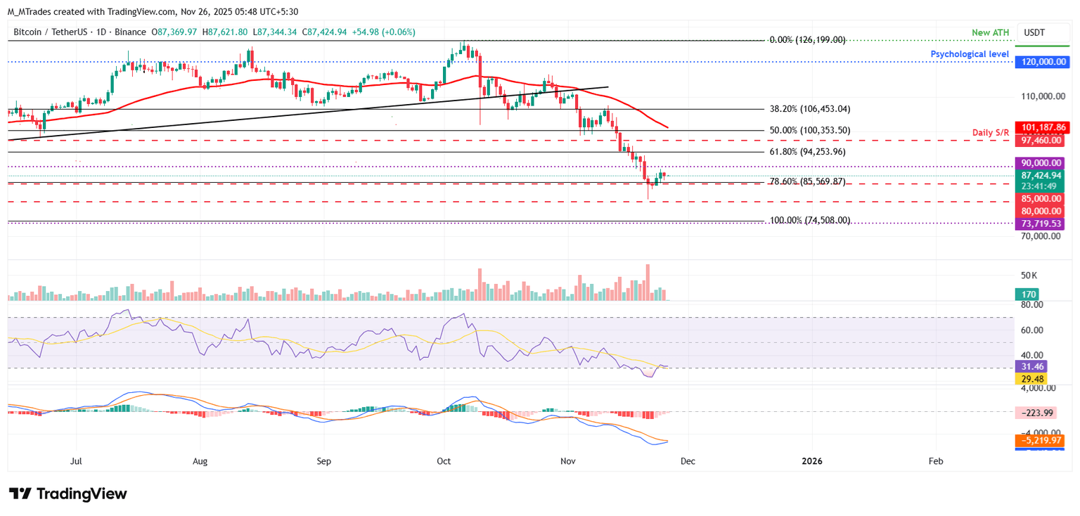 El Índice de Fuerza Relativa (RSI) en el gráfico diario lee 31, después de caer por debajo del umbral de sobreventa la semana pasada, sugiriendo que la presión a la baja podría estar moderándose a medida que el momentum bajista muestra signos tempranos de agotamiento.