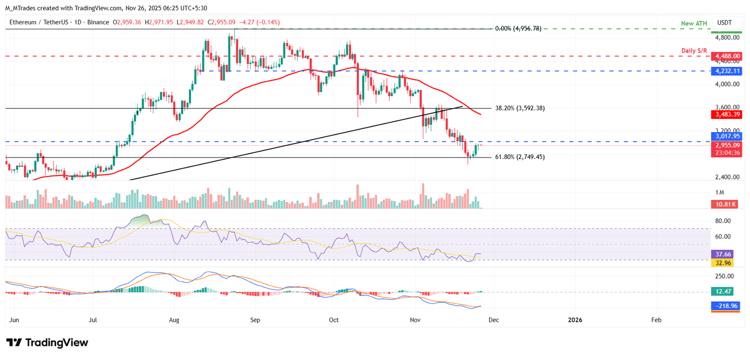 El precio de Ethereum enfrentó un rechazo en la línea de tendencia previamente rota el 13 de noviembre y cayó más del 18% en los siguientes ocho días, alcanzando un mínimo de 2.623$ el viernes. ETH se recuperó casi un 7% en los siguientes tres días, después de encontrar soporte cerca del nivel de retroceso de Fibonacci del 61.8% en 2.749$. En el momento de escribir el miércoles, ETH ronda alrededor de 2.900$.