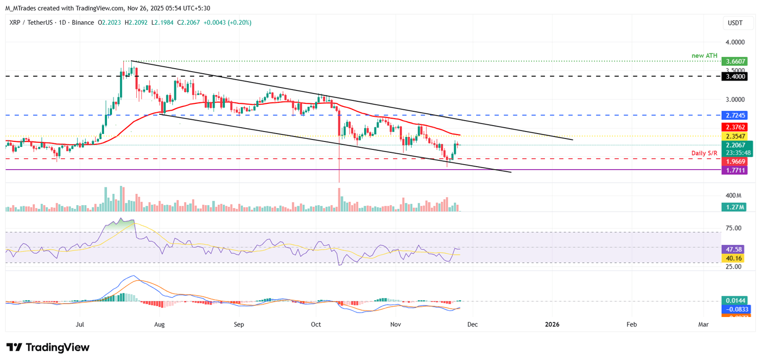 - El precio de XRP se mantiene por encima de 2$, rebotando desde el límite inferior de un canal descendente la semana pasada.