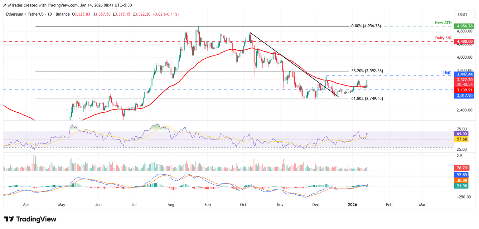 El precio de Ethereum encontró soporte alrededor de la EMA de 50 días en 3.139$ la semana pasada y se mantuvo alrededor de esta zona durante todo el lunes. El martes, ETH subió más de un 7% y cerró por encima de 3.325$. A partir del miércoles, ETH se cotiza alrededor de 3.200$.