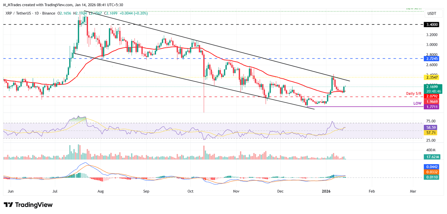 El precio de XRP encontró soporte alrededor de la EMA de 50 días en 2.07$ la semana pasada y se mantuvo alrededor de esta zona durante todo el lunes. El martes, XRP subió más de un 5%. En el momento de escribir el miércoles, XRP se cotiza alrededor de 2.16$.