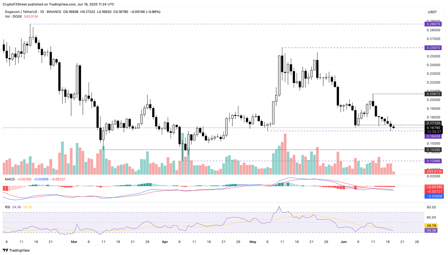 Si Dogecoin se mantiene por encima de $0.1642, una reversión podría elevarse hacia el máximo mensual de $0.2067.