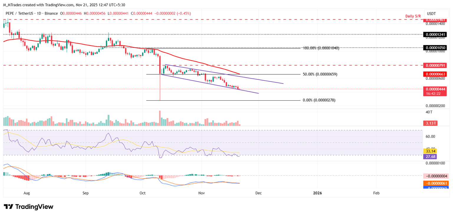 El precio de Pepe enfrentó un rechazo en el límite superior de la línea de tendencia el 11 de noviembre y cayó más del 31% en los siguientes 10 días. Al momento de escribir el viernes, PEPE continúa cotizando cerca del límite inferior de la línea de tendencia.