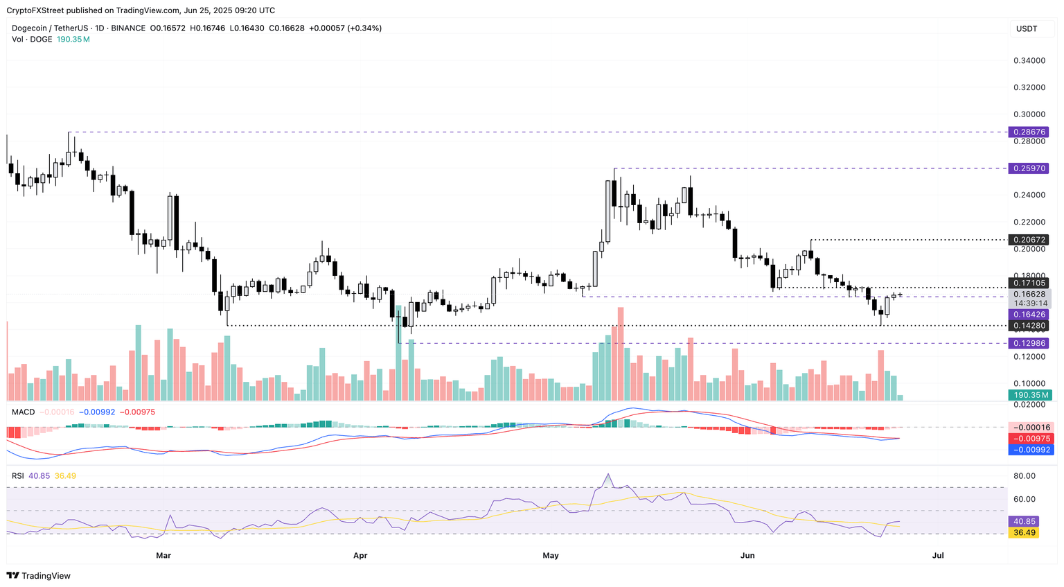 La resistencia inmediata para DOGE se sitúa en 0.1710$, marcada por el precio de cierre del 5 de junio. Un empuje limpio en el cierre diario por encima de este nivel podría extender la recuperación de Dogecoin hasta la cifra redonda de 0.20$, cerca del máximo mensual.