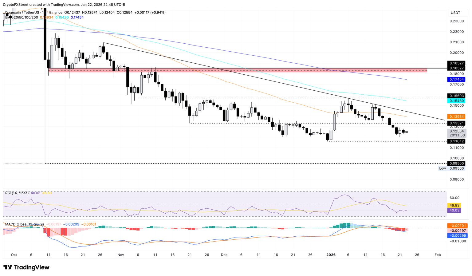 Si DOGE cae por debajo del soporte de 0.1161$ marcado por el mínimo del 31 de diciembre, arriesgaría una mayor baja hacia el mínimo del 10 de octubre en 0.0950$.
