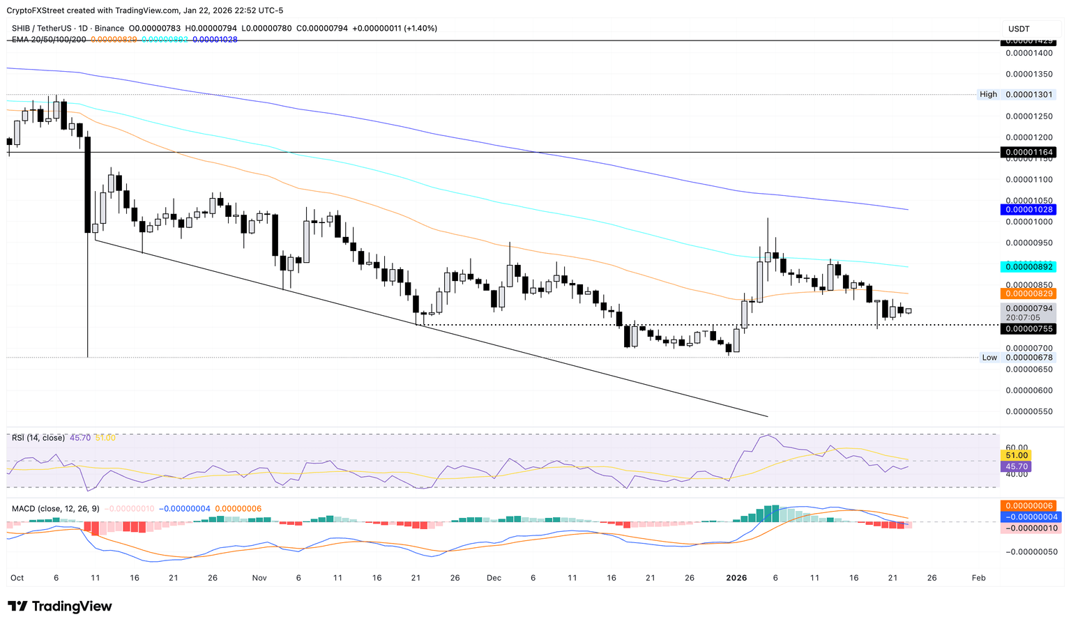 Shiba Inu recupera más del 1% en el momento de escribir el viernes, consolidándose por debajo de la EMA de 50 días en 0.00000829$. SHIB se mantiene por encima del soporte de 0.00000755$ marcado por el mínimo del 21 de noviembre.