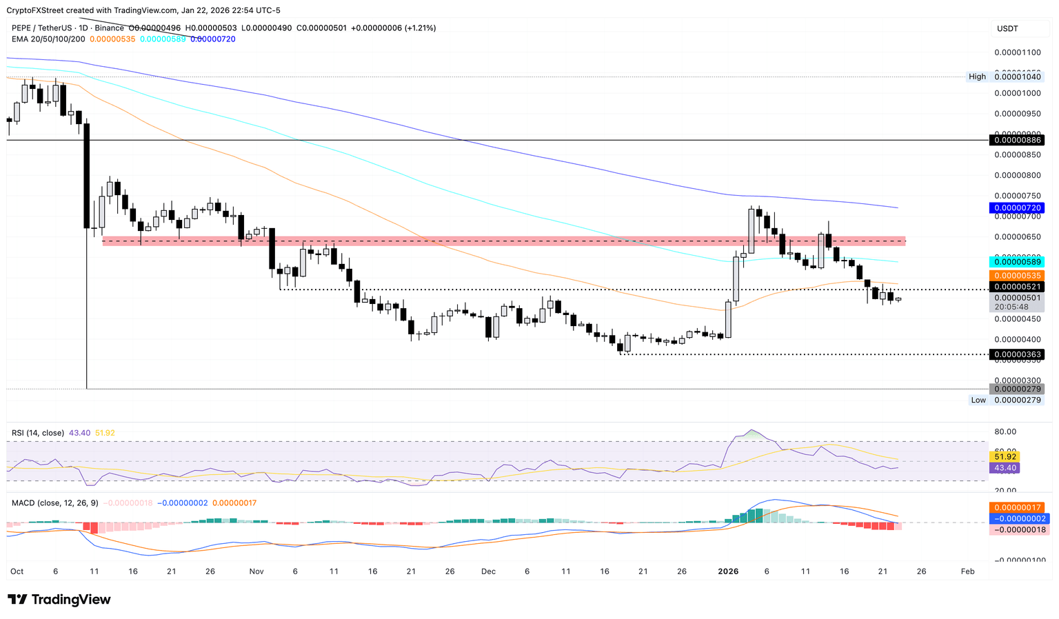 Si PEPE rebota desde 0.00000500$, enfrentaría resistencia inmediata en la EMA de 50 días en 0.00000535$, seguida de la EMA de 100 días en 0.00000589$.
