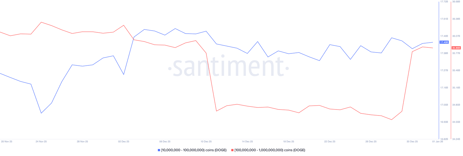 Los datos en cadena muestran que las tenencias de ballenas de DOGE aumentaron esta semana, mientras que la venta de SHIB y PEPE añadió presión de suministro. Según Santiment, las ballenas que poseen de 100 millones a 1.000 millones de DOGE tienen un total de 35.86 mil millones de DOGE, un aumento desde los 34.59 mil millones del domingo, lo que indica una mayor confianza entre los inversores de grandes carteras.