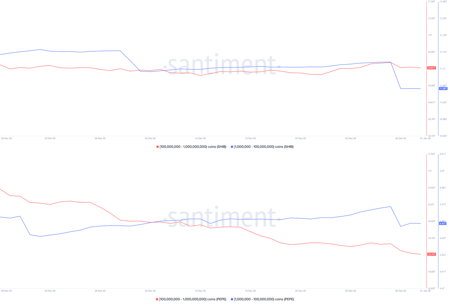 Las monedas meme, incluyendo Dogecoin (DOGE), Shiba Inu (SHIB) y Pepe (PEPE), comenzaron el Año Nuevo bajo presión bajista tras la caída del miércoles del 2% al 4%. Los inversores de grandes carteras, conocidos popularmente como ballenas, acumulan DOGE pero pierden confianza en SHIB y PEPE. Técnicamente, las monedas meme están preparadas para una mayor caída en medio de una intensa presión de venta y una falta de recuperación sostenida en Bitcoin (BTC).