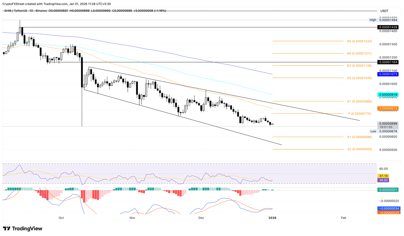 Shiba Inu está en una tendencia a la baja dentro de un patrón de cuña ampliada, como lo indican dos líneas de tendencia divergentes en el gráfico diario. Al momento de escribir, SHIB ha subido un 1% el jueves, recuperándose de la caída del 2.68% del día anterior.