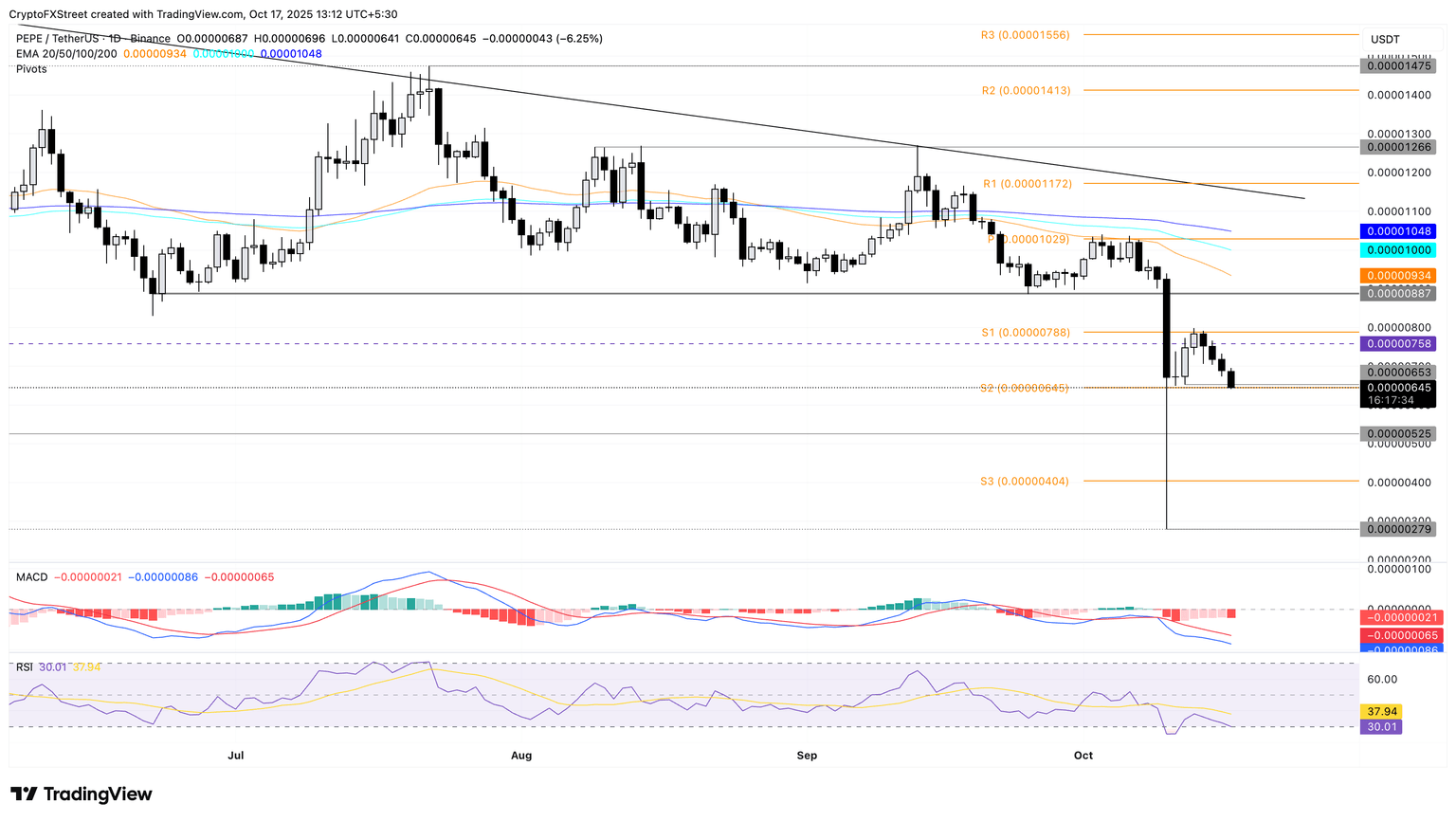 Pepe se desploma más de un 6% en el momento de la publicación el viernes, arriesgando un fin de semana bajista por delante. La moneda meme con temática de rana prueba el nivel del Punto de Pivote S2, actuando como el nivel de soporte inmediato, en 0.00000645$.
