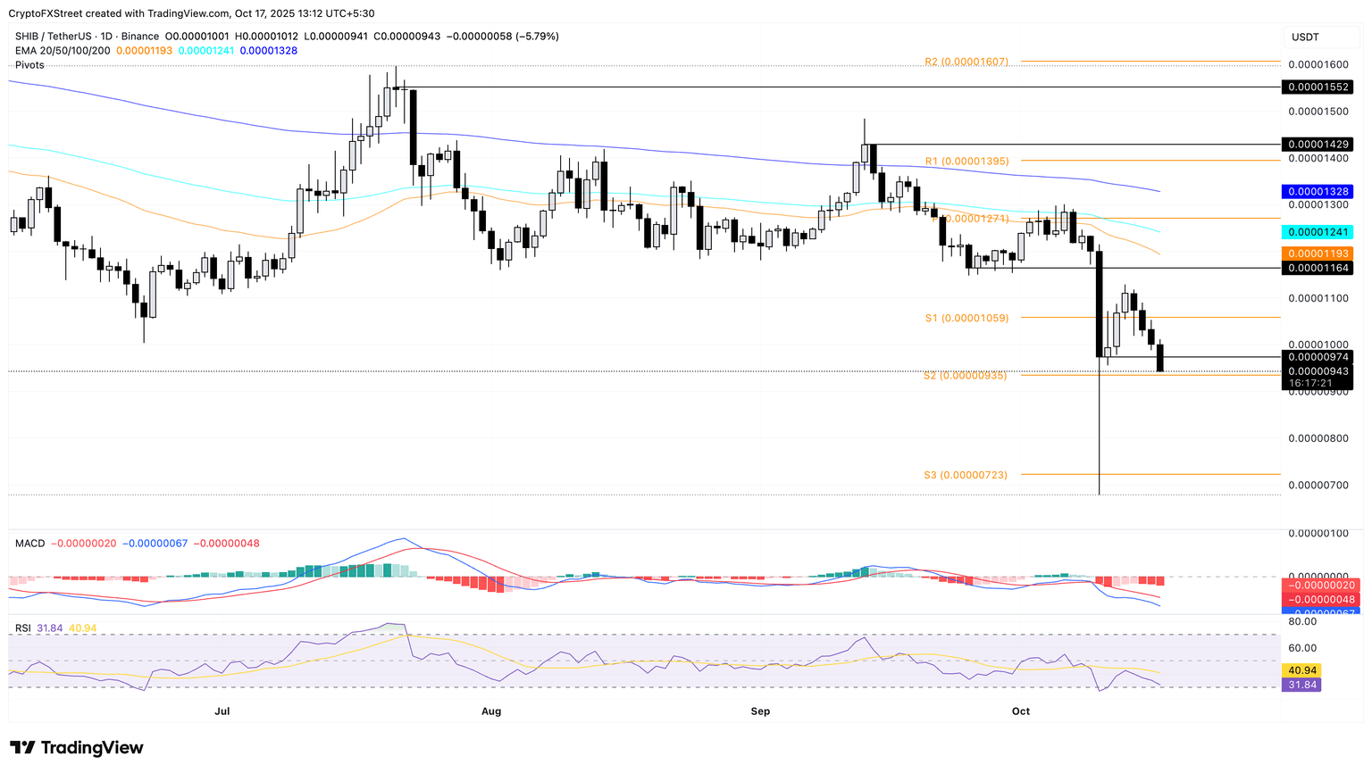 - Shiba Inu bajo alta presión vendedora rompe por debajo del soporte psicológico de 0.00001000$.