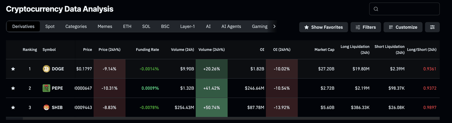 Datos de derivados de monedas meme. Fuente: CoinGlass