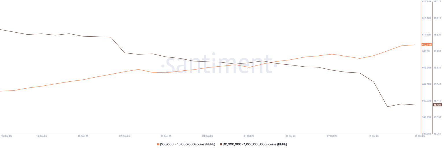 De manera similar, los grandes inversores de billetera con 10 millones a 1 mil millones de PEPE detienen la ola de liquidaciones, estabilizando sus tenencias en 15.42 billones.