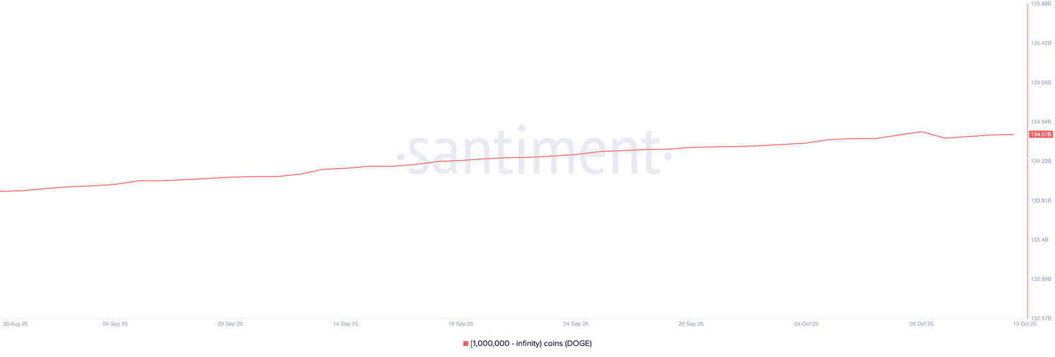 Dogecoin cotiza por encima de 0.20000$ en el momento de la redacción el lunes, manteniendo las ganancias del 11% del domingo. La reversión se alinea con la demanda constante entre los grandes inversores de billetera, que poseen más de 1 millón de DOGE y un total de 134.51 mil millones de DOGE.
