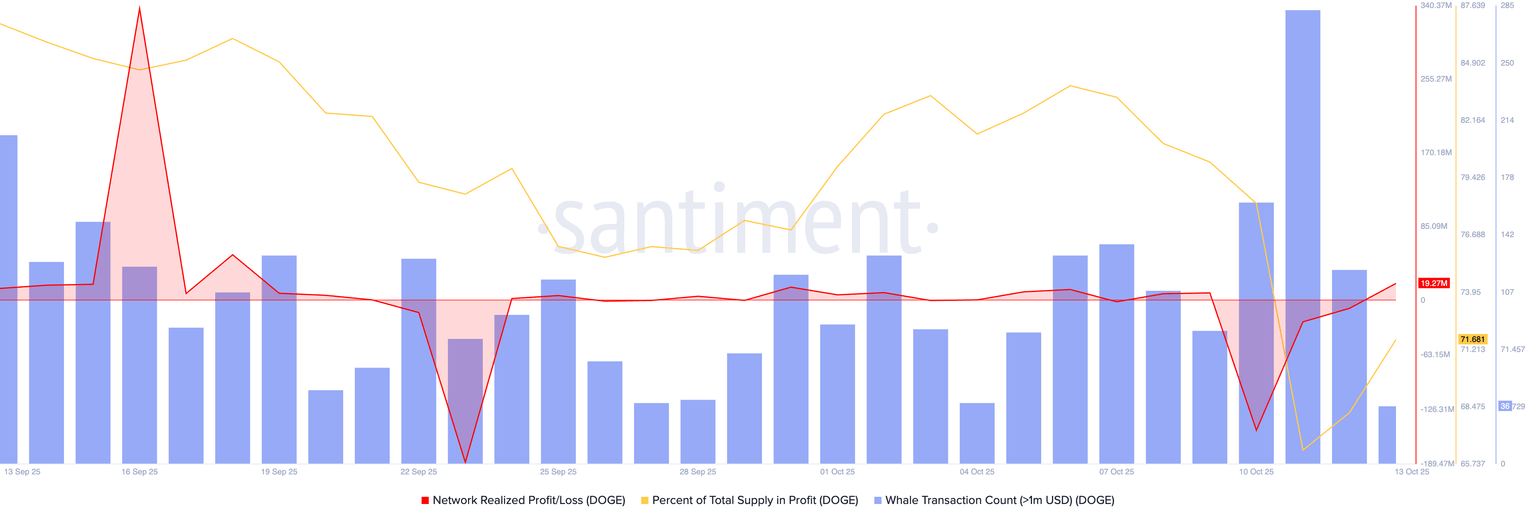 Los datos de Santiment muestran que el Beneficio/Pérdida Realizada en la Red (NRPL) se sitúa en 19.27 millones de DOGE registrados con ganancias el lunes, indicando una recuperación significativa desde los 150.51 millones de DOGE vendidos con pérdidas el viernes. Esta recuperación sugiere una disminución en la presión de venta inducida por el pánico general del mercado, llevando el porcentaje de suministro en ganancias al 71.68% desde el 66.40% del sábado.