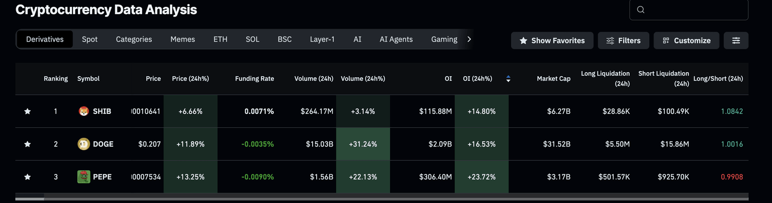 Datos de derivados de monedas meme. Fuente: CoinGlass