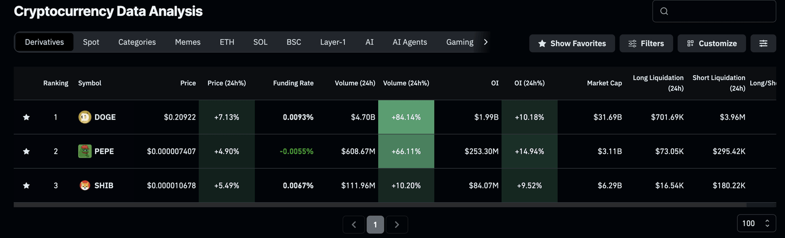 Datos de derivados de monedas meme. Fuente: CoinGlass