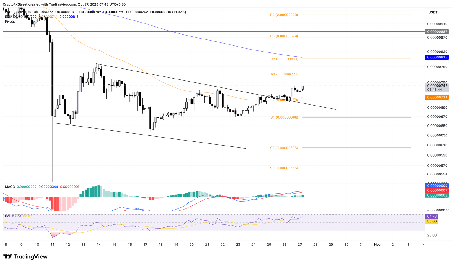 Al igual que Shiba Inu, Pepe extiende una recuperación de ruptura de canal descendente en el gráfico de 4 horas. PEPE cotiza por encima de 0.00000700$ en el momento de la redacción el lunes, avanzando en la tendencia alcista por quinto día.