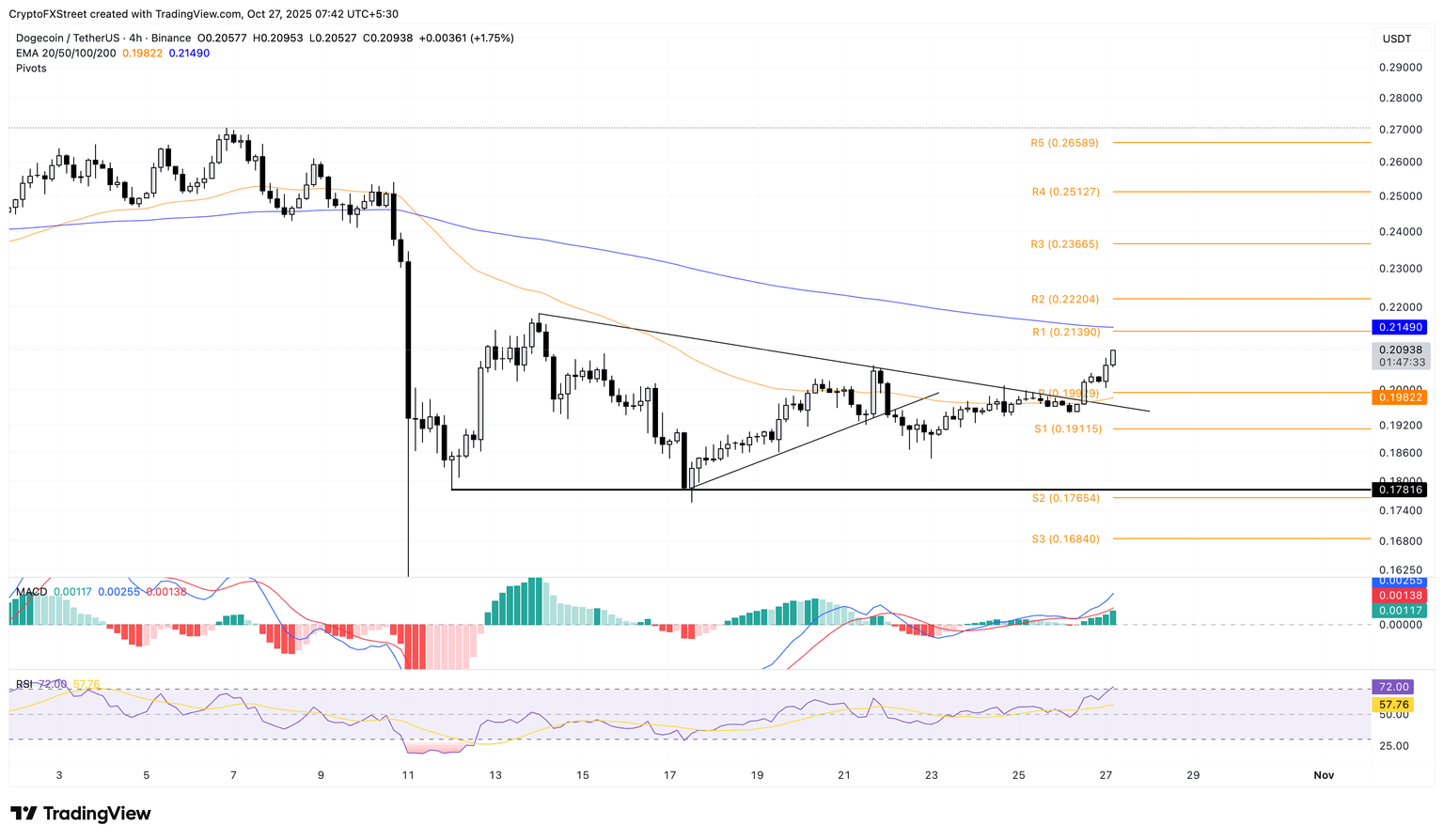 La recuperación de Dogecoin tiene como objetivo la media móvil exponencial (EMA) de 200 periodos en 0.21490$, ligeramente por encima del punto de pivote R1.