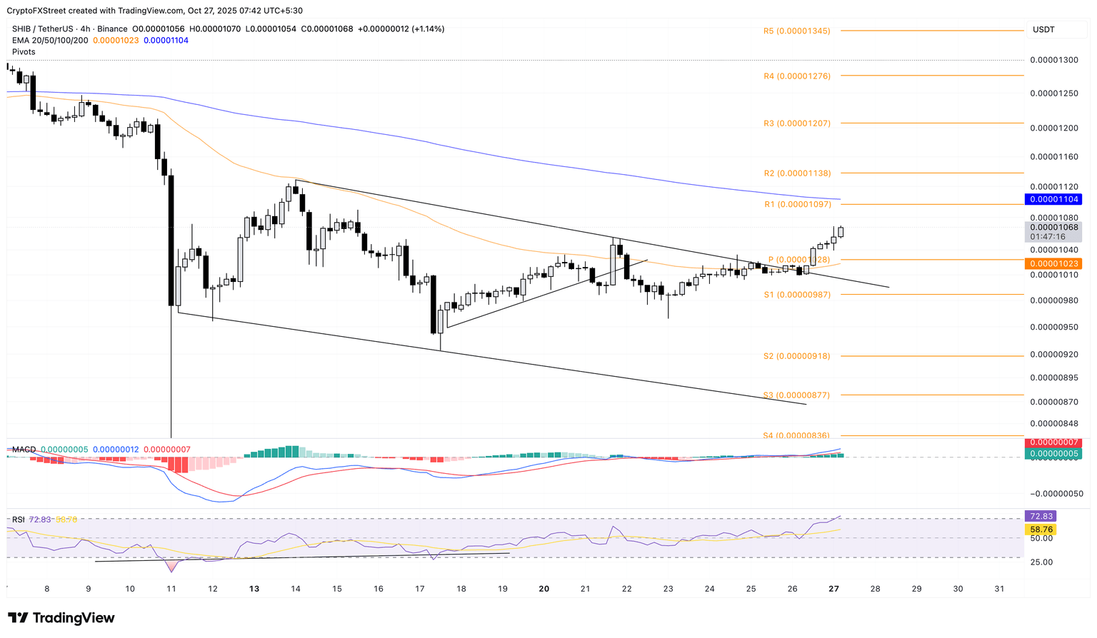 Shiba Inu cotiza por encima del nivel psicológico de 0.00001000$ en el momento de la redacción el lunes, con un aumento de casi el 5% en las últimas 24 horas. La moneda meme marcó una ruptura de canal descendente en el gráfico de 4 horas, apuntando a la EMA de 200 periodos en 0.00001104$.