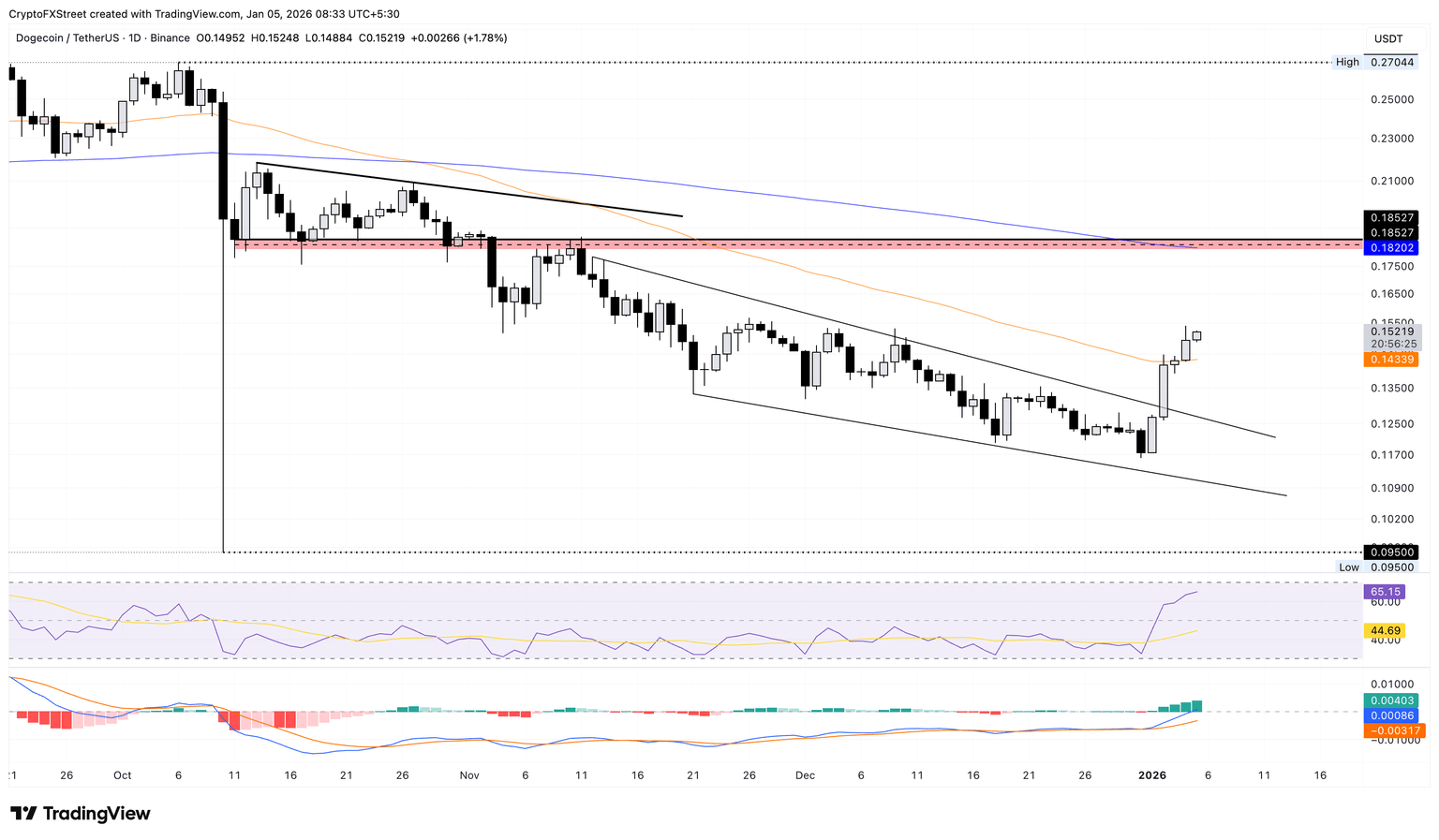 La recuperación de Dogecoin refleja la recuperación de un patrón de cuña descendente en el gráfico logarítmico diario. La recuperación busca la EMA de 200 días en $0.18202, alineándose con la zona de oferta superior entre $0.18100 y $0.18500.