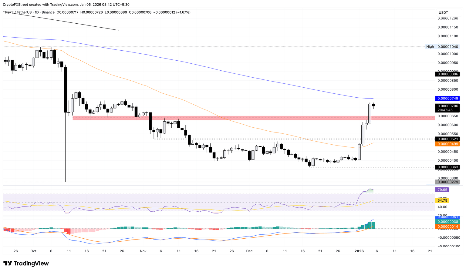 - Pepe se acerca a la EMA de 200 días con los toros apuntando a una ruptura tras una recuperación del 77% en los últimos cuatro días.