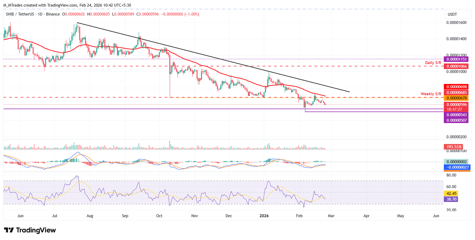 Si SHIB continúa su tendencia a la baja, podría extender la corrección hacia el mínimo del 6 de febrero de 0.0000050$.