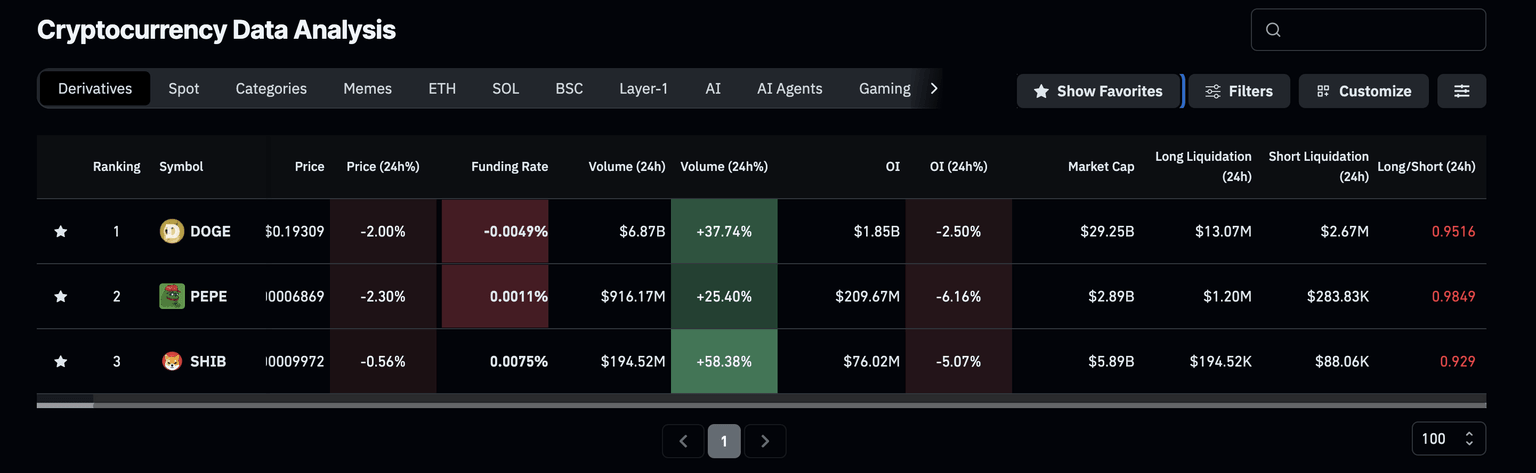 Datos de derivados de monedas meme. Fuente: CoinGlass