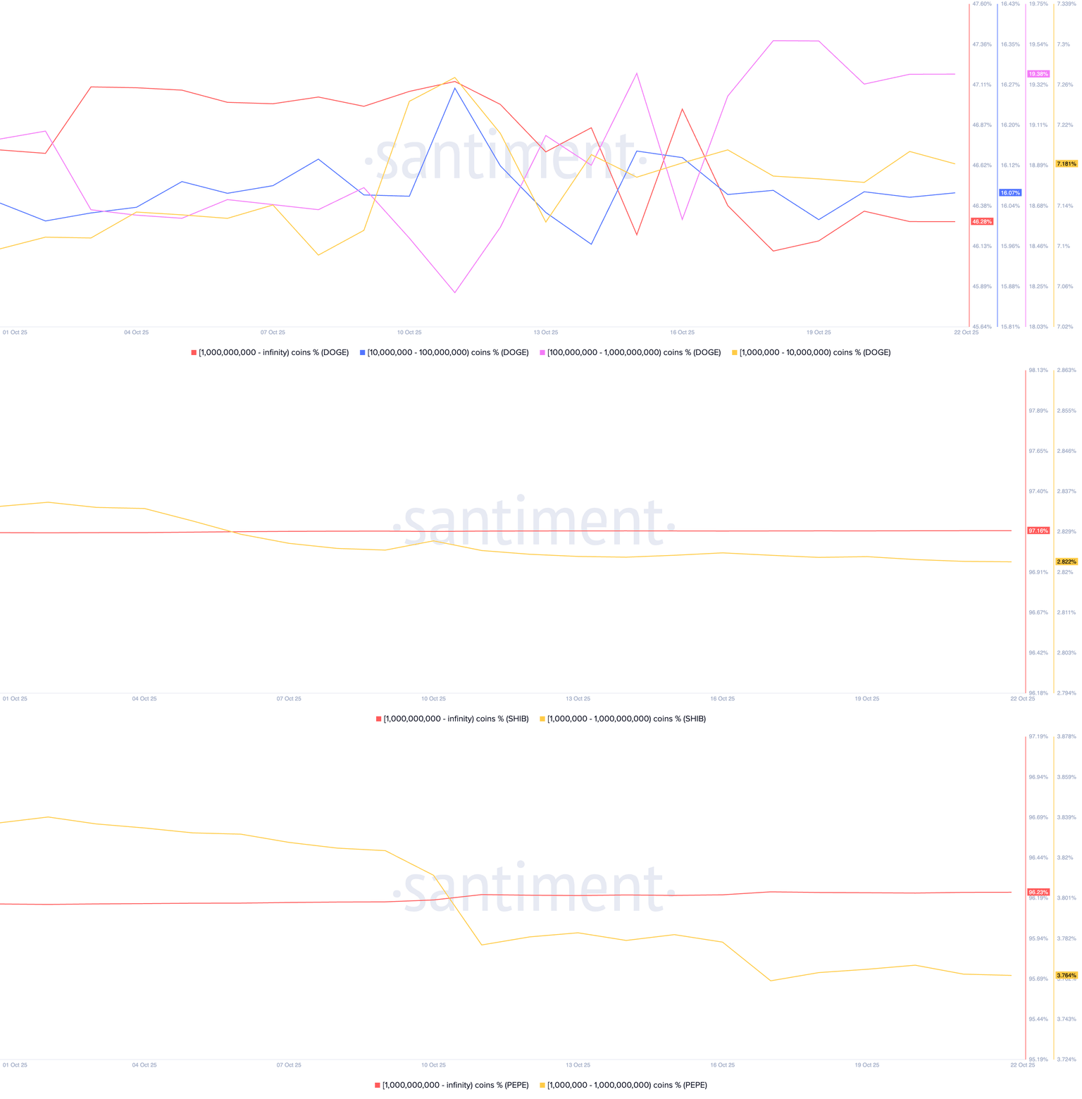 Los datos de Santiment muestran que los inversores de DOGE con más de 1 mil millones de tokens han descargado sus tenencias al 46.28% del suministro disponible desde el 46.75% el 1 de octubre.