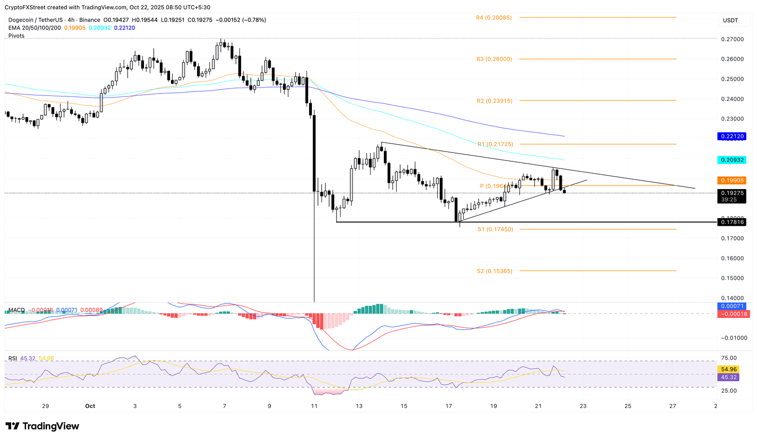 Un posible rebote en DOGE debería superar el máximo del martes en 0.2056$ para confirmar la ruptura de la línea de tendencia, lo que podría apuntar al nivel del Punto Pivote R1 en 0.2172$.