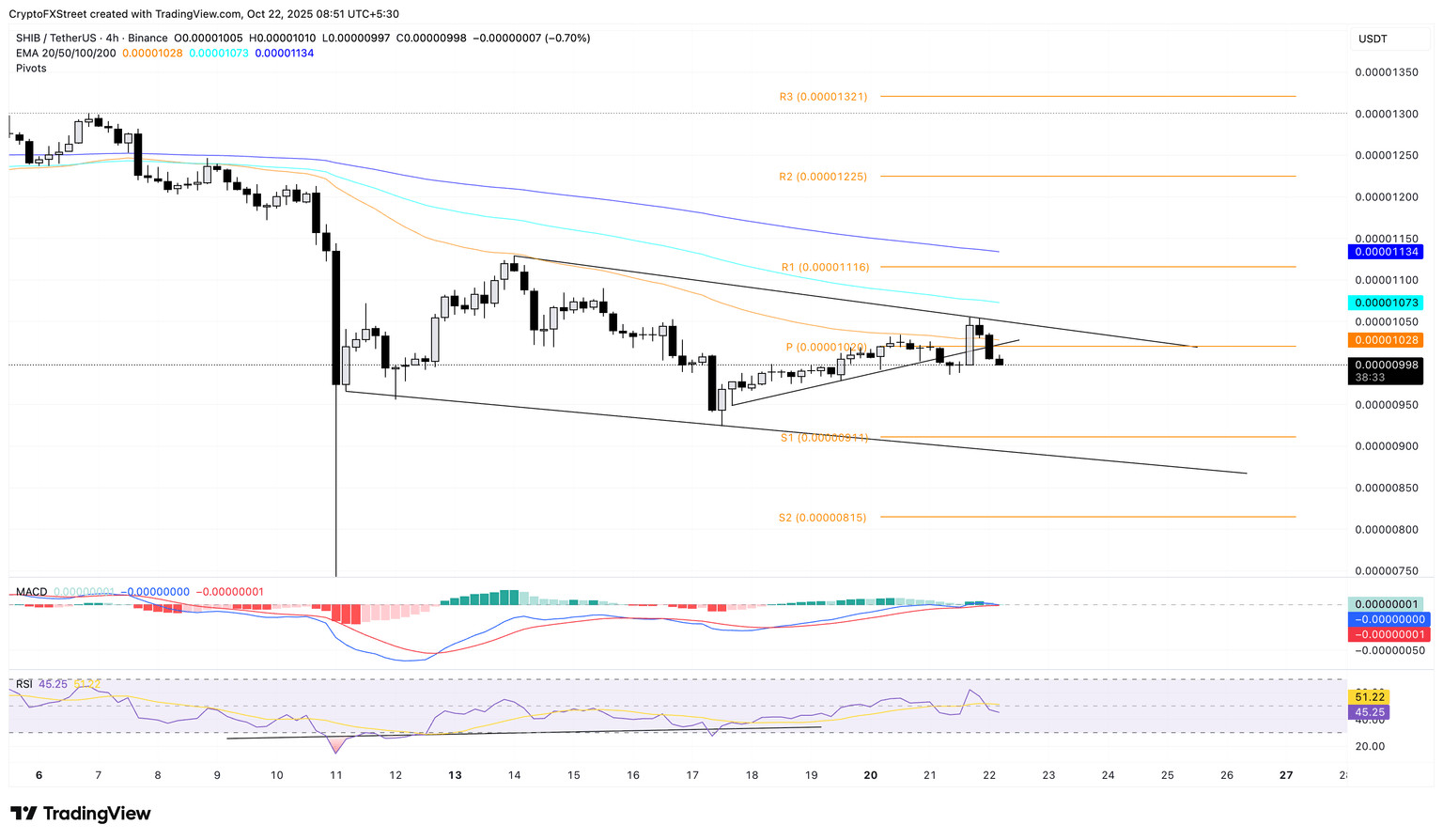 - Shiba Inu retrocede por debajo del nivel psicológico de 0.00001000$, con los bajistas apuntando al nivel de soporte de 0.00000911$.