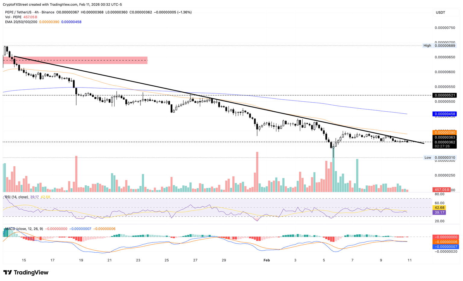En el gráfico de 4 horas, la moneda meme con temática de rana está revirtiendo desde una línea de tendencia de resistencia hacia el mínimo del 6 de febrero en 0.00000310$.