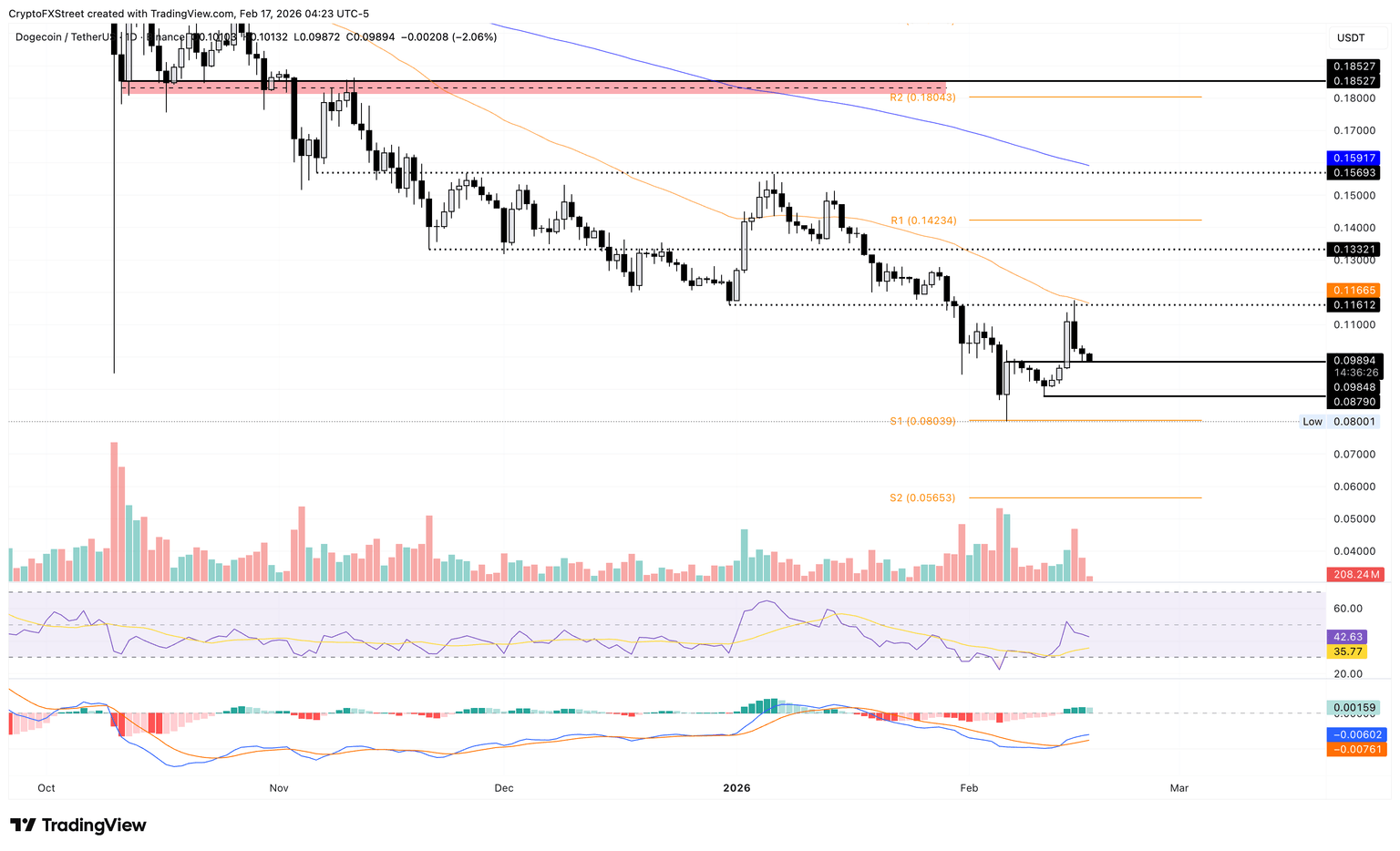 Dogecoin está cotizando por debajo del nivel psicológico de 0,1000$ en el momento de la publicación el martes, registrando una caída del 2% hasta ahora en el día. La moneda meme con temática de perro extiende el declive por tercer día consecutivo, poniendo a prueba el precio de cierre del 6 de febrero de 0,0984$.