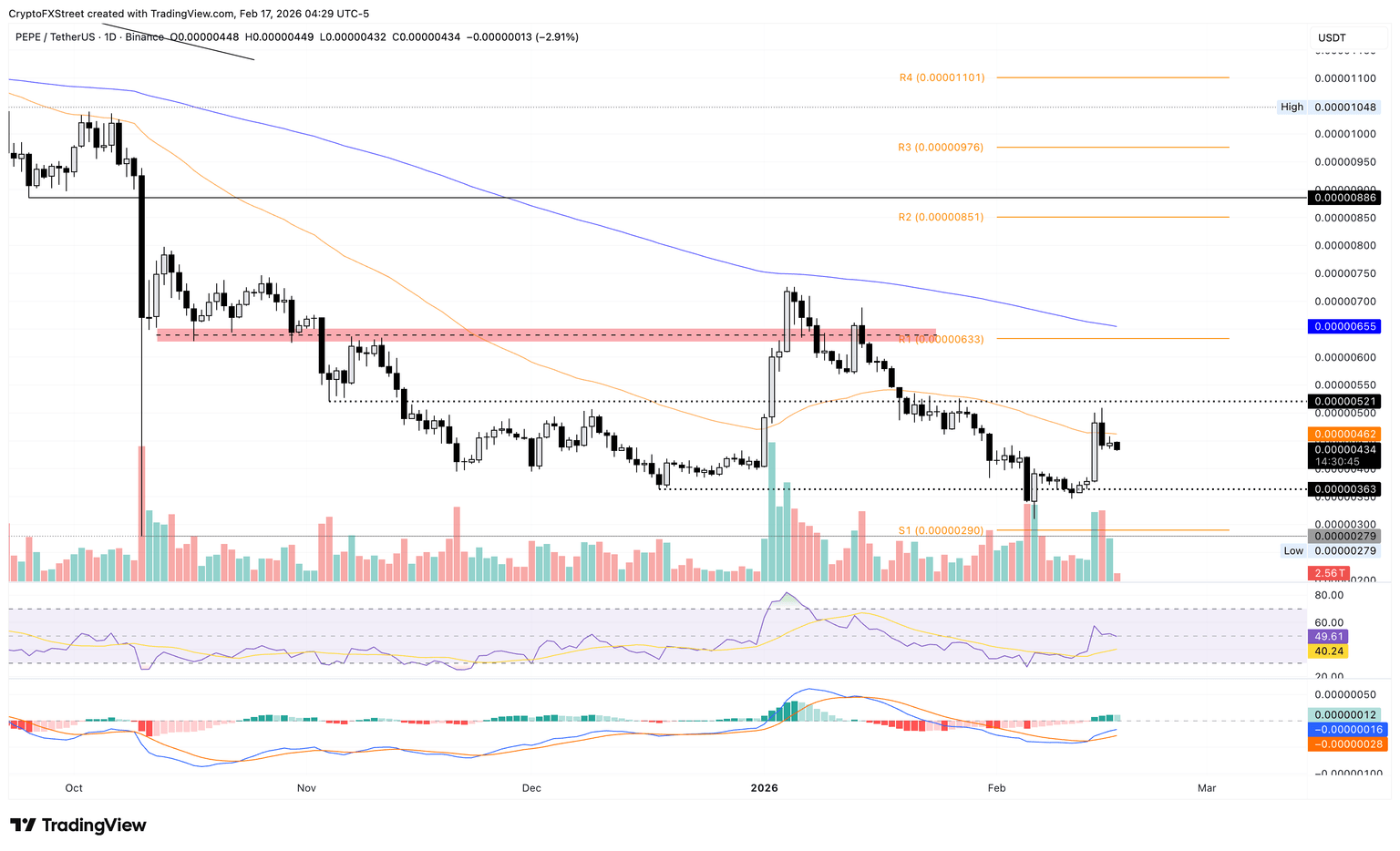 Pepe debería superar el nivel de resistencia de 0,0000521$, que limitó las ganancias a finales de enero, para una recuperación sostenida hacia el punto de pivote R1 en 0,0000633$.