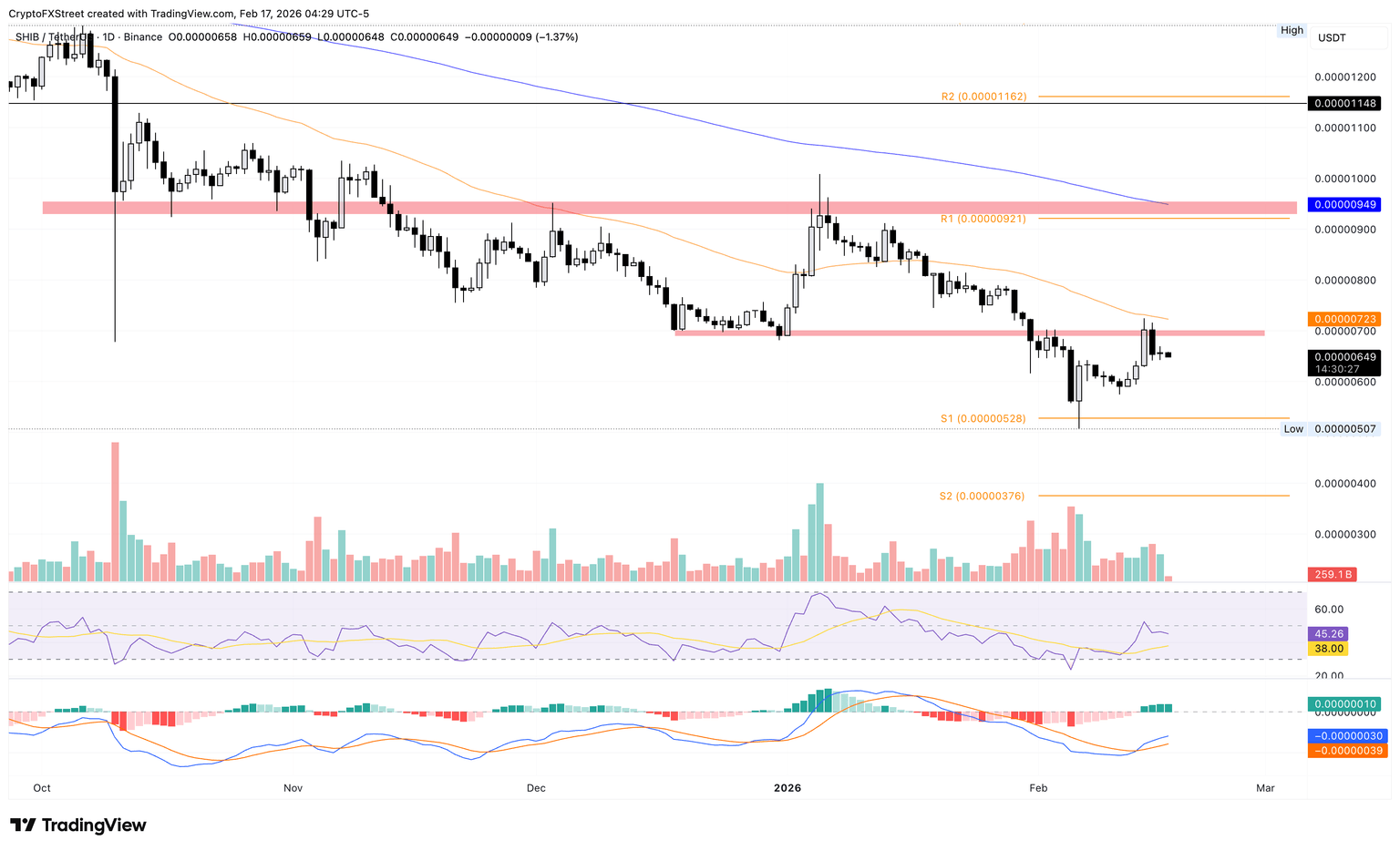 Al igual que Dogecoin, los indicadores técnicos en el gráfico diario sugieren un retroceso en el impulso alcista para Shiba Inu. El RSI en 45 cae por debajo de la línea media, mientras que el histograma positivo del MACD se contrae, indicando una presión de compra reducida.