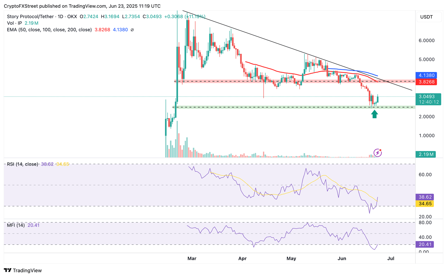 El precio de Story ha recuperado el soporte en 3.00$ después de extender su caída en junio en casi un 42% hasta 2.46$. La reversión, que supera el 10% el lunes, marca el tercer día de una racha alcista constante, respaldada por la nueva entrada de dinero en IP.