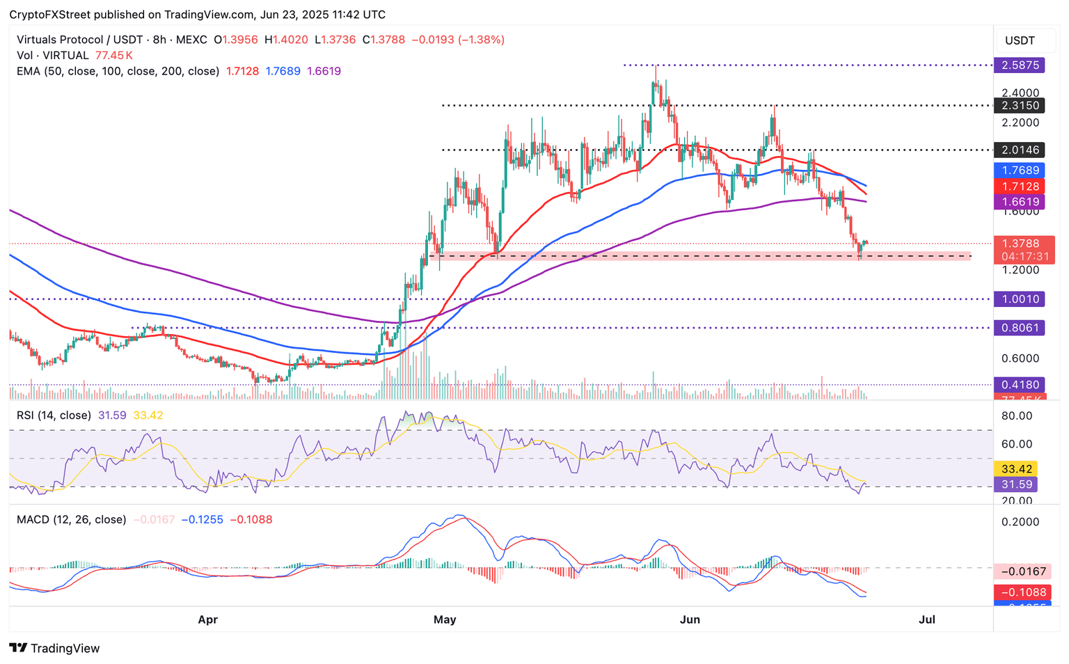 El precio de Virtuals Protocol se mantiene por encima del soporte en 1.25$, cotizando alrededor de 1.37$ en el momento de escribir. El interés en el token de IA está en camino tras el colapso desencadenado por el conflicto Israel-Irán.