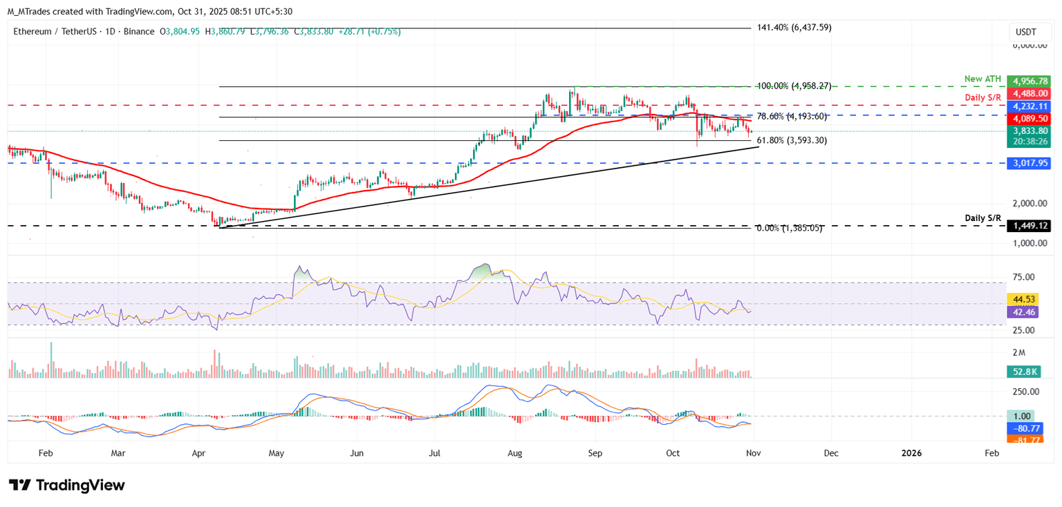 El precio de Ethereum enfrentó un rechazo del nivel de resistencia diario en 4.232$ el lunes y cayó un 8.86% para el jueves. Al momento de escribir el viernes, el ETH se sitúa alrededor de 3.833$.