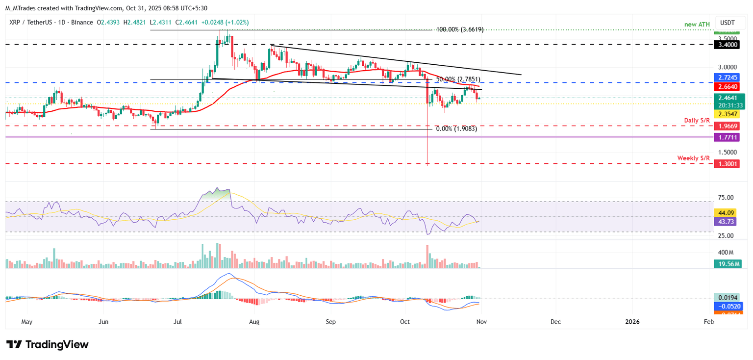 El precio de XRP enfrentó un rechazo de la EMA de 50 días en 2.66$ el lunes y cayó casi un 8% hasta el jueves, volviendo a probar el nivel de soporte diario en 2.35$. Al momento de escribir el viernes, el XRP se sitúa alrededor de 2.46$.