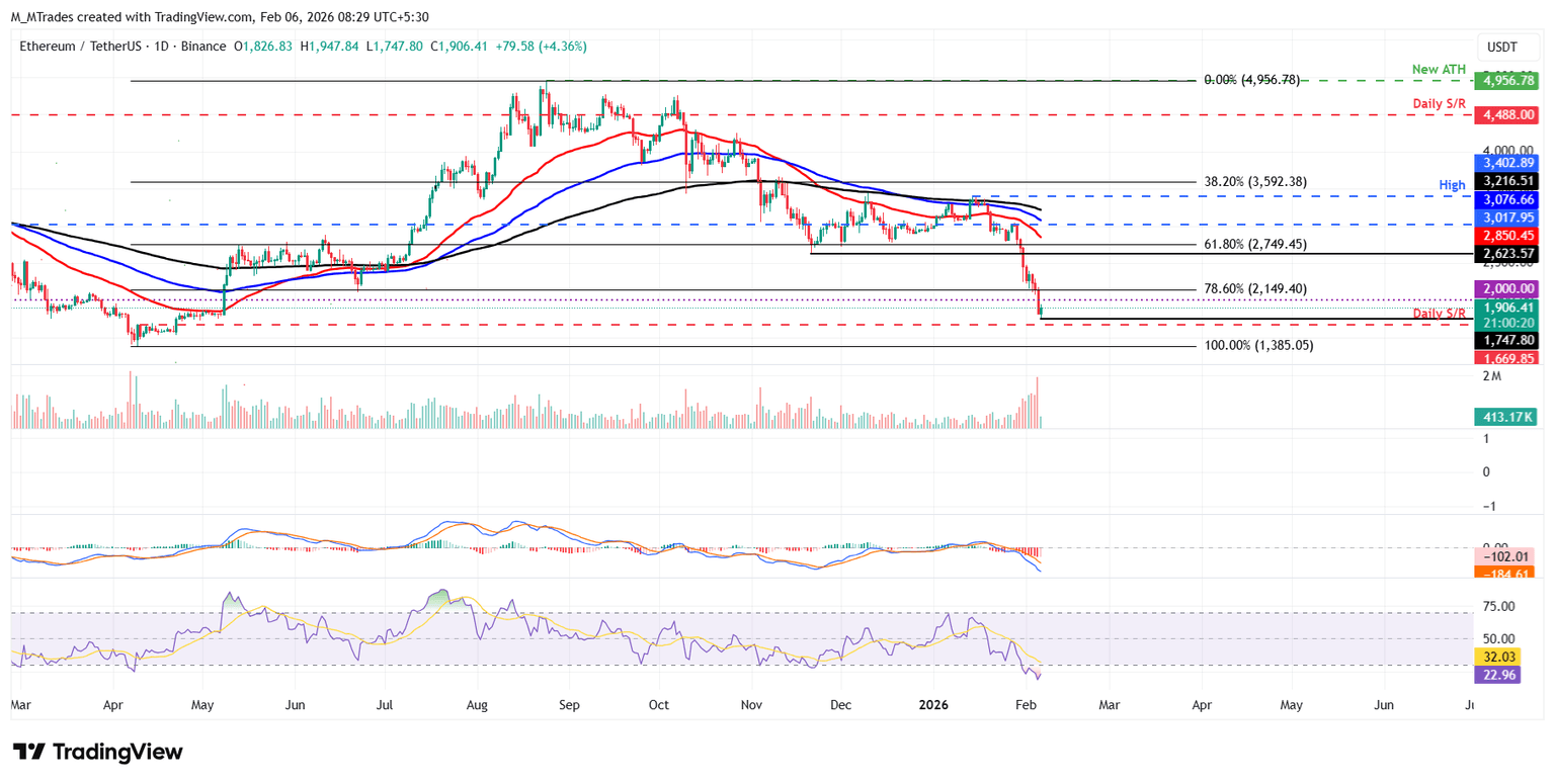 El precio de Ethereum ha corregido más del 15% hasta ahora esta semana, alcanzando un mínimo de 1.747$ el viernes, niveles no vistos desde el 6 de mayo de 2025.