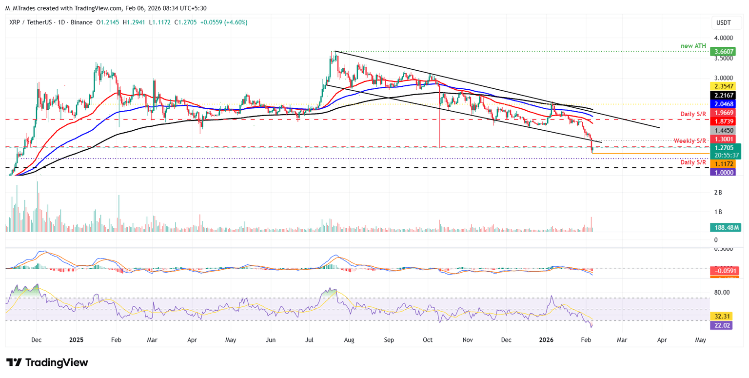 El precio de XRP corrigió más del 20% hasta ahora esta semana, alcanzando un mínimo de 1.11$ el viernes, un nivel no visto desde principios de noviembre de 2024.