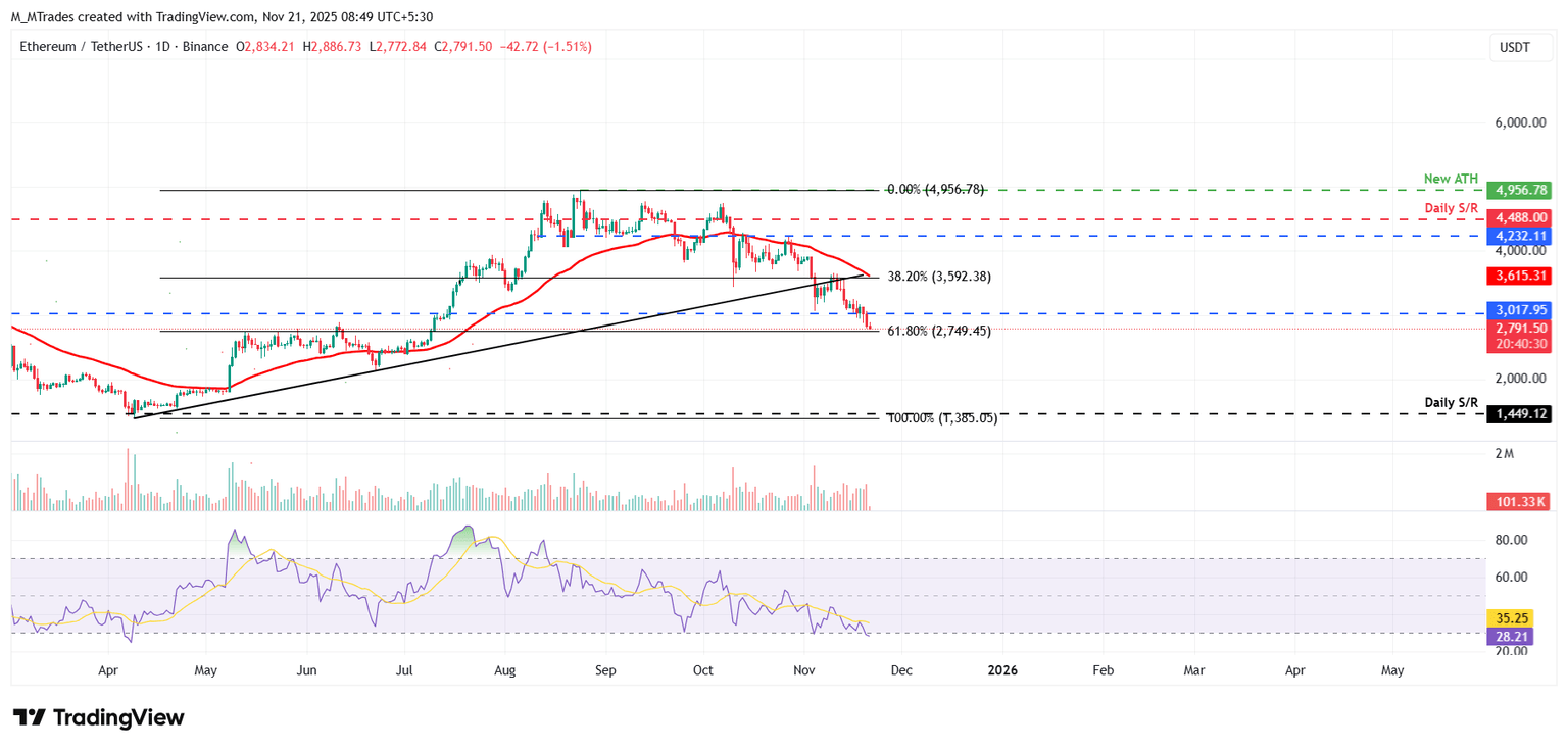 El precio de Ethereum enfrentó un rechazo en la línea de tendencia rota anterior alrededor de 3.592$ la semana pasada y cayó casi un 14%. ETH continuó su corrección, bajando un 9.38% hasta el jueves, y cerró por debajo del soporte clave en 3.017$. Al momento de escribir el viernes, ETH continúa su corrección, cotizando por debajo de 2.791$.