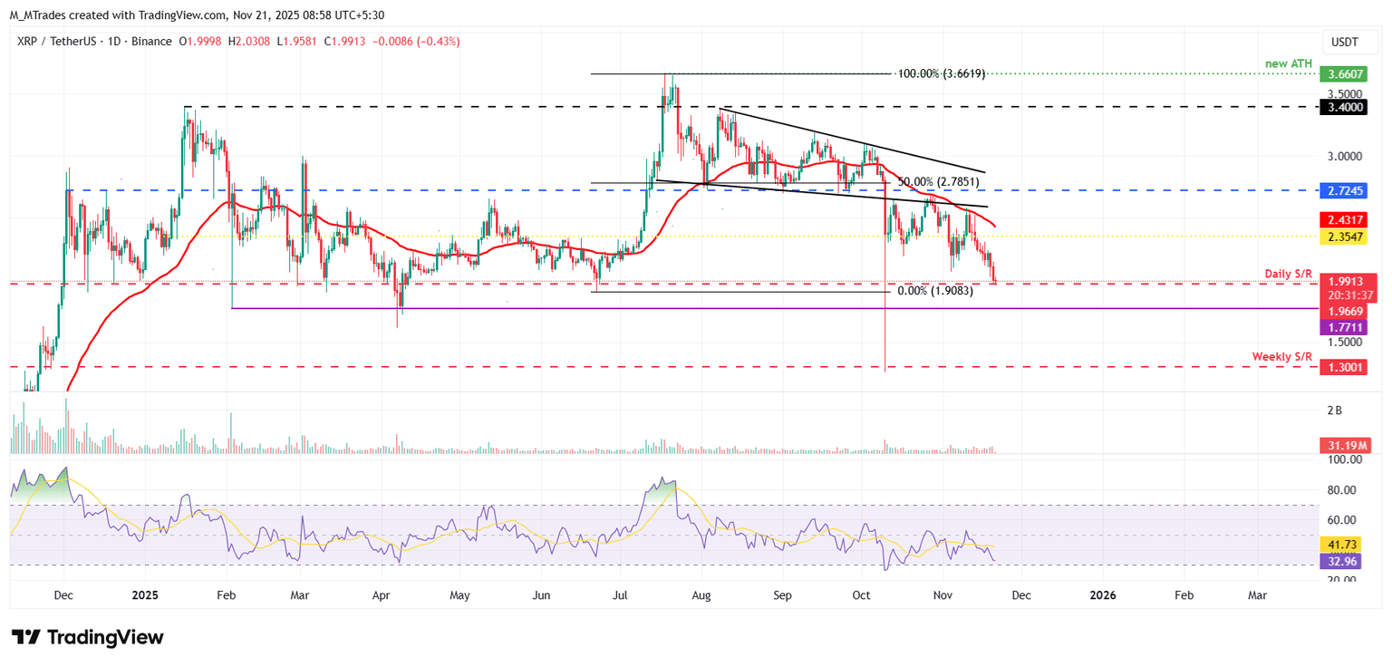- XRP cae por debajo de 2$, sugiriendo una corrección más profunda en medio de una presión bajista intensificada.