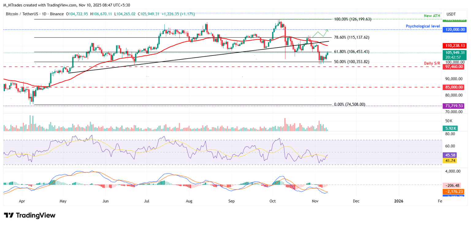 El precio del Bitcoin encontró soporte alrededor del retroceso del 50% en 100.353$ el 4 de noviembre y lo volvió a probar durante los siguientes cuatro días. El domingo, BTC rebotó un 2.36%. Al momento de escribir el lunes, BTC está extendiendo su operación de recuperación en 105.900$.