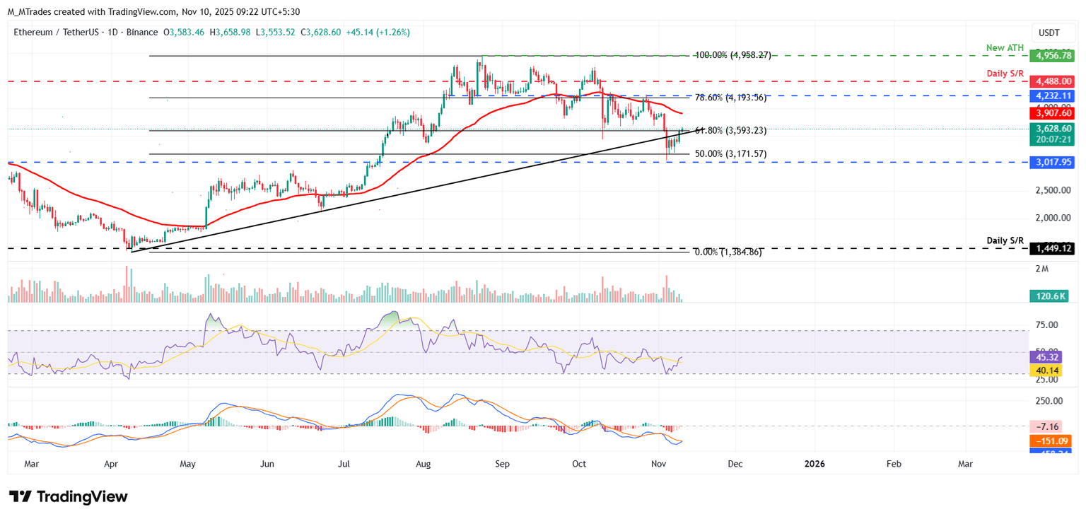 El precio de Ethereum encontró soporte alrededor del nivel de retroceso del 50% en 3.171$ el 5 de noviembre y se recuperó casi un 5% hasta el domingo. Al momento de escribir el lunes, ETH cotiza por encima de 3.628$.