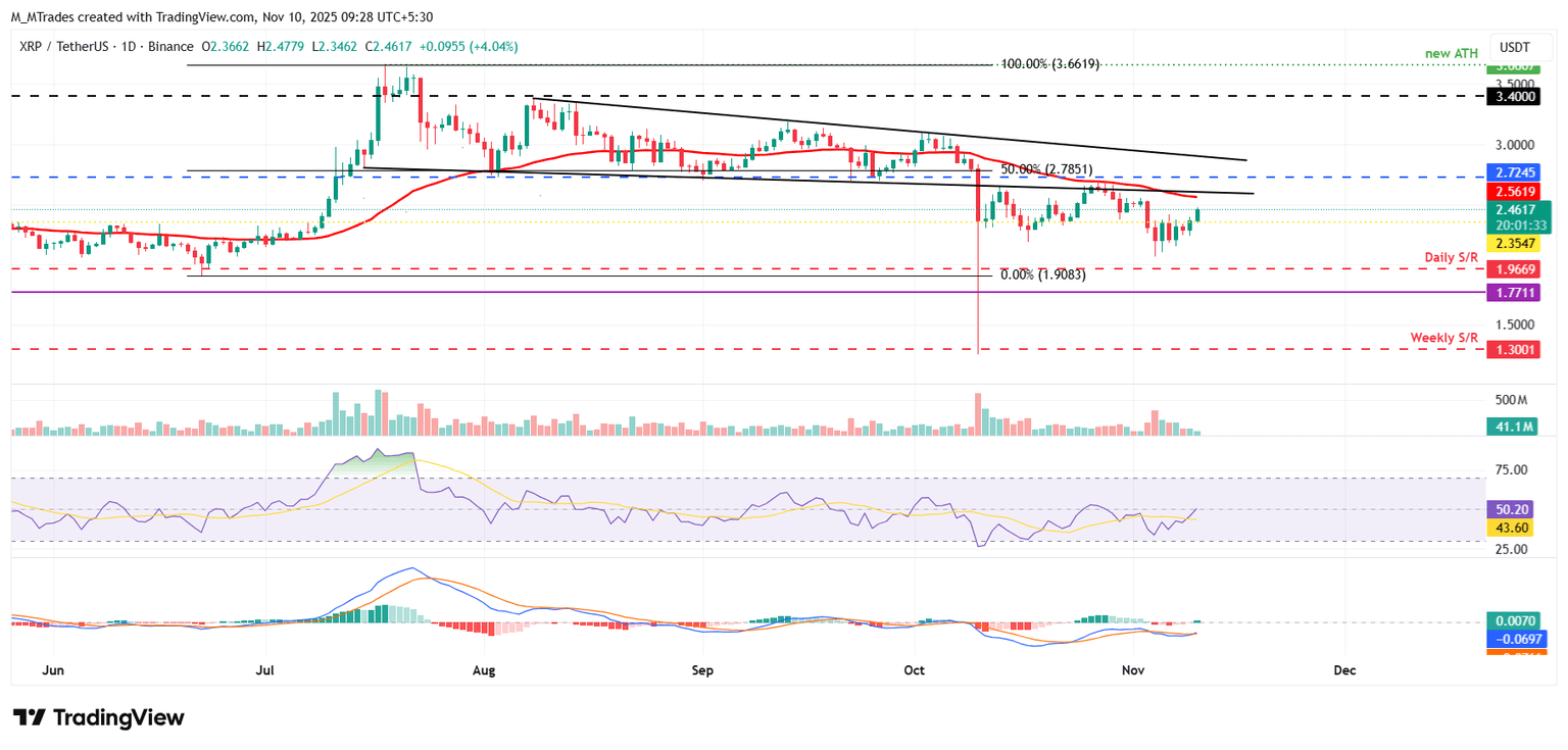 El precio de XRP cerró por debajo del nivel diario en 2.35$ el 3 de noviembre y cayó más del 4% al día siguiente. Sin embargo, XRP encontró soporte por encima del nivel diario en 1.96$ y se consolidó en los siguientes cuatro días. El domingo, XRP subió más del 3% y cerró por encima del nivel de resistencia diaria en 2.35$. Al momento de escribir el lunes, continúa cotizando al alza en 2.46$.